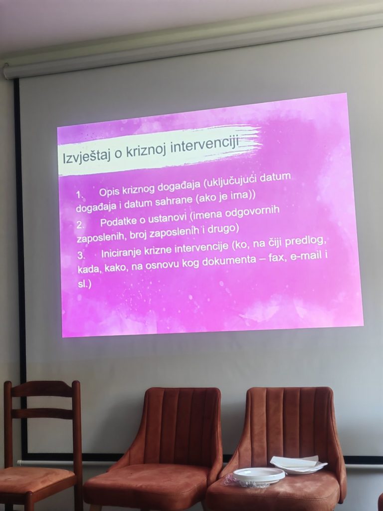 Dvije stručne radnice naše ustanove prisustvovale su dvodnevnoj obuci koju je organizovalo nevladino udruženje Impuls 29. i 30. septembra 2025. godine, po akreditovanom programu “ Intervencije u krizi”. Obuka se organizuje u okviru projekta„Savjetodavno- terapijski rad sa ženama koje su žrtve nasilja i njihovom djecom“, koji finansijski podržava Ministrastvo socijalnog staranja brige o porodici i demografije. Opšti cilj programa obuke je obezbjeđivanje kvaliteta u pružanju podrške u kriznim situacijama, kroz usvajanje znanja o različitim vrstama kriznih situacija, upoznavanje sa načelima i procesom kriznih intervencija i njihovim ciljevima, kao i usvajanje znanja i vještina potrebnih za sprovođenje svih faza krizne intervencije.