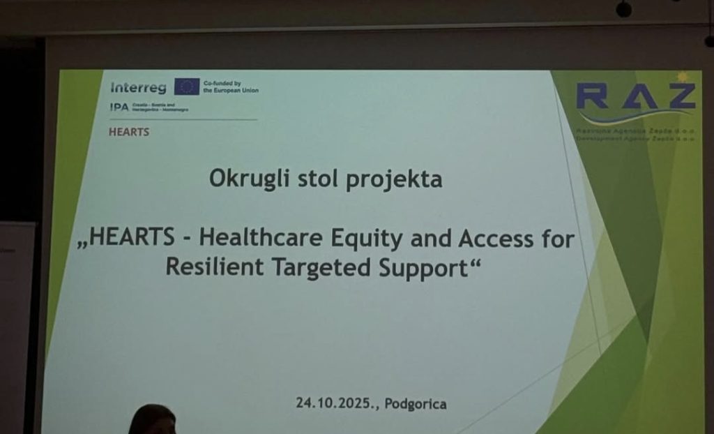 U organizaciji NVO „Udruženje roditelja djece sa teškoćama u razvoju – Podgorica“ , a u okviru projekta prekogranične saradnje „HEARTS – Healthcare Equity and Access for Resilient Targeted Support / „Jednak pristup zdravstvenim uslugama za sve ranjive kategorije u prekograničnom prostoru“ je održan okrugli sto ,,Prekograničnom saradnjom do poboljšanja položaja djece i mladih sa smetnjama u razvoju”. Na okruglom stolu su kolege iz Centar za pružanje usluga zajednici Vukovarsko sremske županije iz Hrvatske i kolege iz JU Dom zdravlja sa stacionarom Žepče i Razvojne agencije Žepče iz Bosne i Hercegovine govorili o unapređenju položaja djece i mladih sa smetnjama i teškoćama u razvoju, ranoj intervenciji, podršci porodici i razvoju kvalitetnih usluga u zajednici. Ovom događaju je ispred JU Dnevni centar za djecu i omladinu sa smetnjama i teškočama u razvoju prisustvovala direktorica mr Olga Rovčanin.