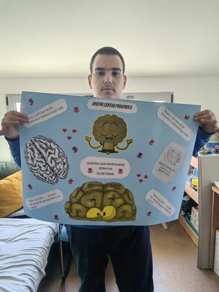 Korisnici su, zajedno sa zaposlenima, izrađivali zajednički plakat – bojali su, rezali i lijepili crteže i motivacione poruke koje podsjećaju na značaj brige o mentalnom zdravlju, podrške i međusobnog razumijevanja.